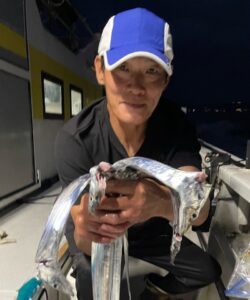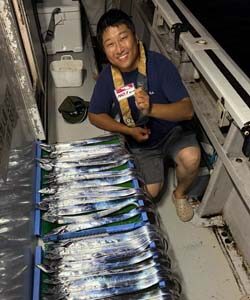 午前とはまた違ってなかなかテクニカルな釣りに! 雨も混じりながらでしたが、時合いでは一気に上がる場面も! 少人数ではありましたが、楽しい時間をすごせたのでは? 明日は全便満船! 気合い入れて行ってきます。 釣果は宮脇さんがジギングでタチウオ最大85cmを40尾。 藤原さんがテンヤでタチウオ最大88cmを32尾。 テンヤはほかに22尾、28尾の方いらっしゃいました! 本日もありがとうございました!