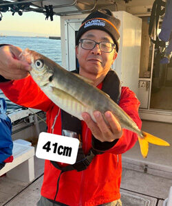 今日のアジのご機嫌が良く、釣り場に着くなりいきなり中アジがあちこちで上がる!上がる! お子様も頑張って沢山釣られてました。 そして撒き餌が効いてきたのか、2連、3連と中アジラッシュが! そうした中、船内が「デカっ!!」「おっきい!!」と大盛り上がり! なんと41cmのアジがあがり、見るからに迫力が違いました!お見事です! そのほかアジ&サバで4連などもありました! トップは山岡さんがアジ最大28c...
