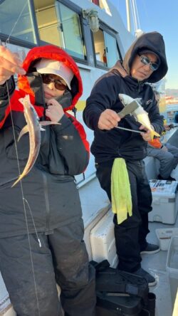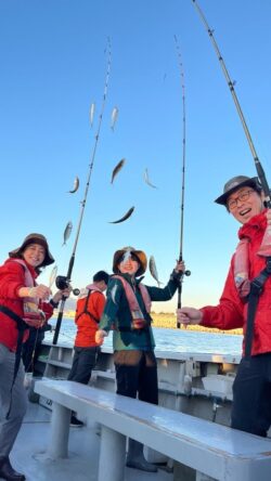 ポカポカ陽気の午後アジショート便は、レンタル竿で参加の仲良しファミリーやお友達同士の参加もたくさんで笑顔と歓声! 小アジは入れ食いでした! 28cm前後の中アジも度々姿を現し、大盛り上がり!楽しい時間でした! 本日のトップの方が中アジを15尾! 釣りすぎた! 本日もありがとうございました! ジャンジャンお電話お待ちしております!