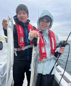 今日の午後タチウオ便はいきなりのディープからのスタート。 それでも反応良く、パタパタと釣れてくれました。 しかし後半からは雨に降られ、一気に失速気味。 厳しい時間となりましたが、寒い中頑張ってくださいました。 風邪をひかないように、お風呂でしっかり温まってから美味しいタチウオ食べてくださいね♪ 本日のトップは浜本さんでテンヤでタチウオ最大85cmを12尾。 テンヤは他にも10尾の方に、9尾の方が2...