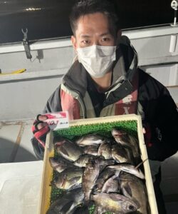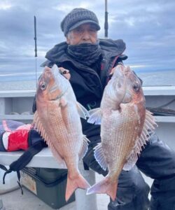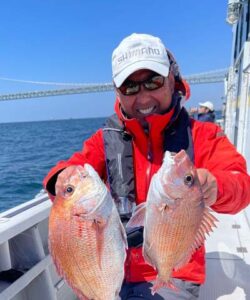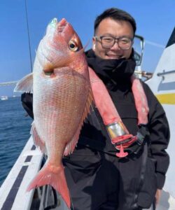今週は寒さがぶり返し桜の花もそろそろ散り始めているようです。 陽が登上れば幾分和らぐものの朝晩は冷えますね〜 マダイの方はジワジワとよくなってはいるのかな? 食べ頃サイズが上がってますね! 酒井さんがマダイ最大46cmを2尾。 ありがとうございました!